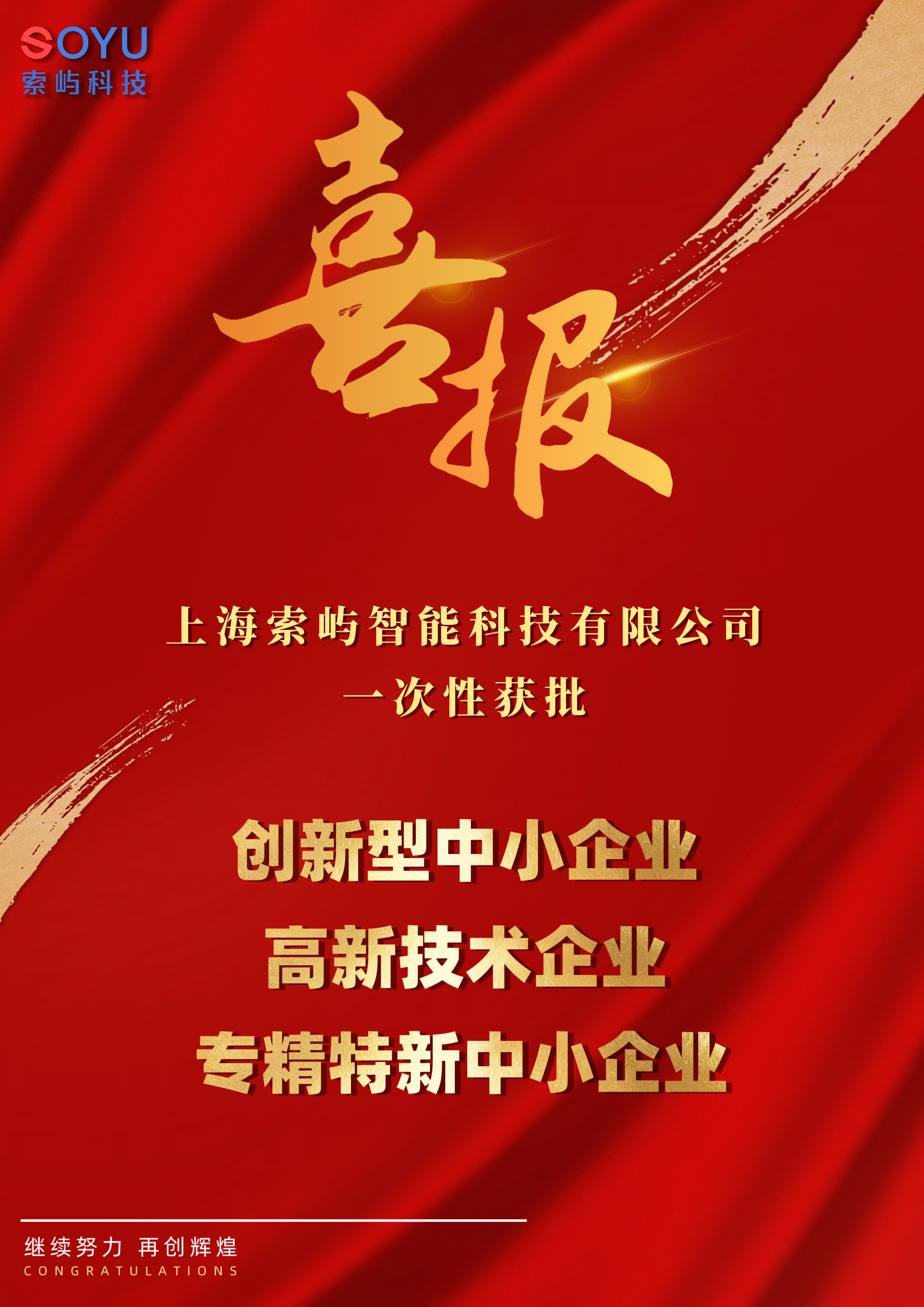 Shanghai Suoyu Intelligent Technology Co., Ltd. has been approved as an "Innovative Small and Medium sized Enterprise", "High tech Enterprise", and "Specialized, Refined, Unique, and New Small and Medium sized Enterprise" in one go!